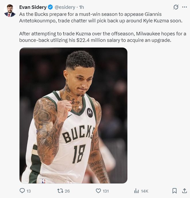 梅吉·塞德利:为了安抚字母哥,迈向必胜的赛季,雄鹿准备用库兹马的合同作为筹码,交易来一名能够改善阵容的球员。库兹马的合同将于2027年夏天到期,未来两个赛季的年薪将分别为2208万美元和2001万美元。今年2月,雄鹿队将夺冠后卫米德尔顿、AJ约翰逊和一个2018年首轮选秀权送到奇才队,换来库兹马、小鲍德温和一个2025年第二轮选秀权。事实上,这笔交易最重要的就是米德尔顿和库兹马交换了俱乐部。事实表明,库兹马肯定会继续在雄鹿队得到重用。上赛季他出战33场比赛,其中首发32场,场均上场31.8分钟,得到14.5分、5.6个篮板和2.2次助攻。今年季后赛,小伙子打了五场比赛,首发四次,大幅下滑。他场均上场20.4分钟,得到5.8分和2.2个篮板。呃游戏。首轮G1对阵步行者队的比赛中,他在大约22分钟内犯规两次,但其他数据全部为零。换句话说,尽管库兹马在2020年为湖人队夺冠做出了巨大贡献,并在2022年至2024年连续两个赛季在奇才队场均得分超过20分,但他在雄鹿队的表现并没有达到预期,甚至可以被认为一文不值。不管怎样,他肯定无法与年薪超过2000万美元的人竞争。如果不能证明其真正的价值,自然就会被束之高阁。然而问题是,库兹马今年季后赛的表现太差了,以至于他剩下的两年价值4209万美元的合同成为了必要的资产负数。目前没有球队打算接手这份合同。否则的话,雄鹿队就会让他在今年夏天的休赛期大获全胜,而不必等到现在。因此,如果雄鹿队想要继续再以点名库兹马换货的方式来扩充他们的击球阵容,估计只能是梦想成真,全败的可能性很大。除非这个家伙在新赛季初期爆发并能在奇才队恢复到场均20分以上的状态,否则他可能有一定的交易价值。顺便说一下,库兹马现在已经30岁了,时间过得真快。那个能在紫金军打球、珍妮阿姨非常喜欢的英俊小伙子,已经不复存在了。我想向所有对比赛结果感兴趣的同学们介绍一下篮球运动员谭彦。最近很火,已经有近16✓14条公众推荐了!我们每天都有免费的公众提名,希望能给您带来一些好的想法。